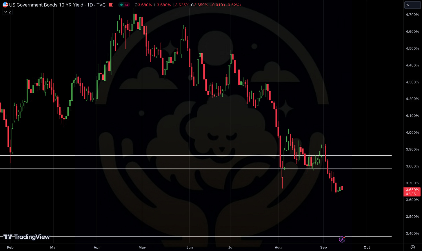 The current economic environment, characterized by rate cuts and slowing growth, is exerting downward pressure on bond yields. I maintain a short term target of 3.95% but yields should remain pressured waiting for the growth slowdown fears to dissipate and stronger economic data. When that happens we should see both yields and stocks up together. Given the anticipated deceleration in economic growth, the neutral rate is likely to be significantly lower than current market consensus, around 2.50% - 2.75% adding pressure on bond yields. Looks like financial media is rallying people to expect a 50 bps cut, which they will only use to rug bonds later when we get a 25bps. Yields are screwed long term as inflation is as good as dead. No doubt that any rally in yields, PMs will use the opportunity to cover their short bond position.