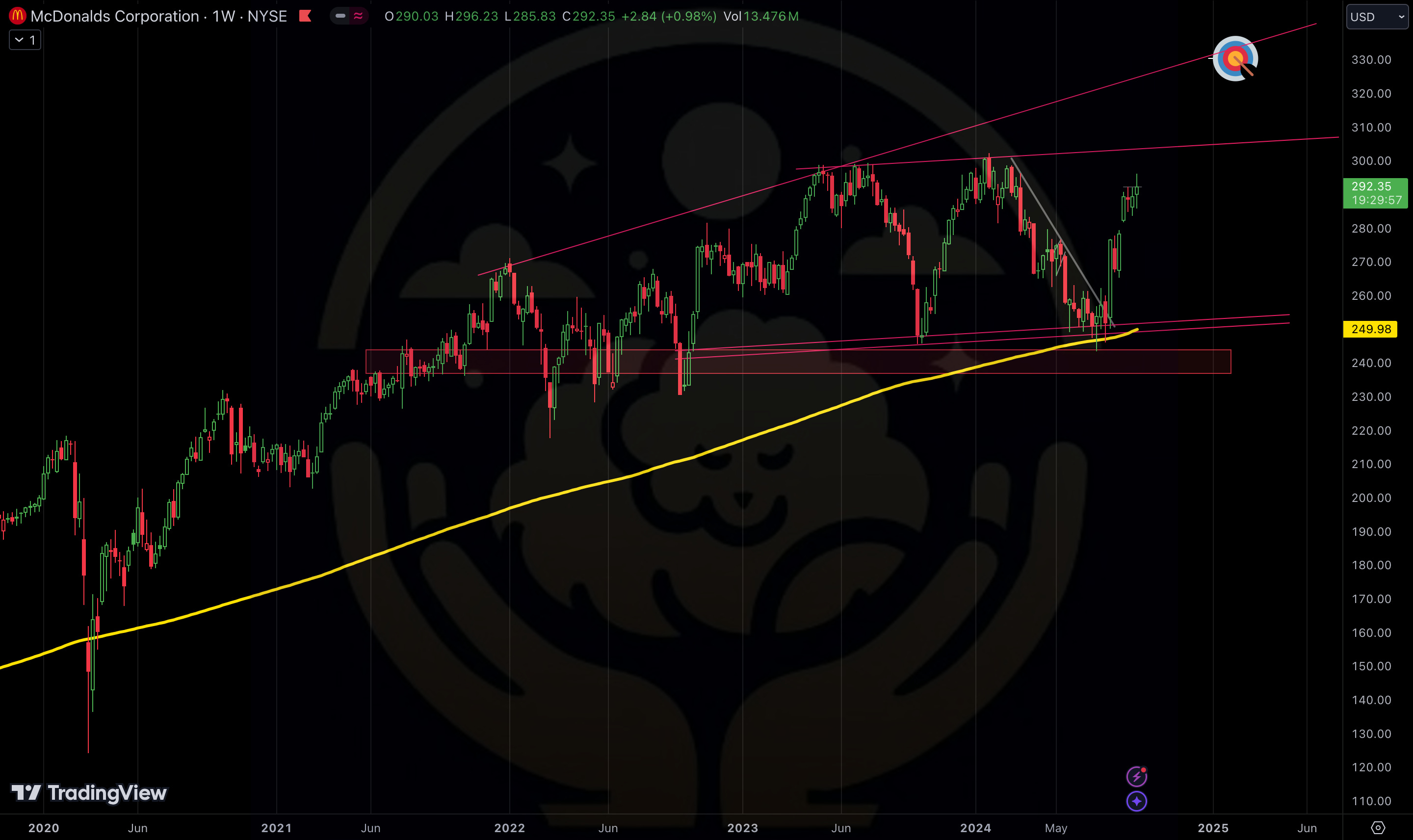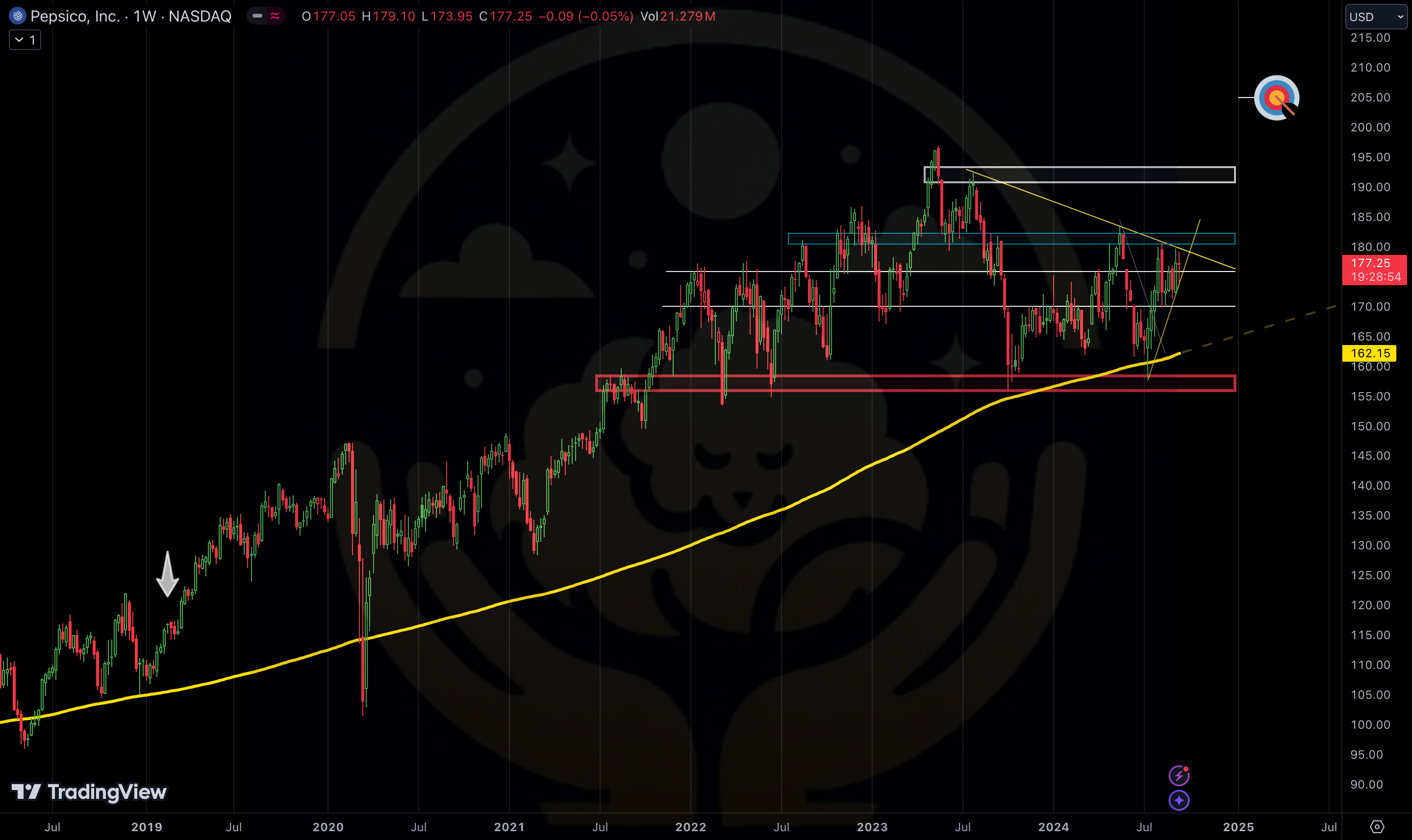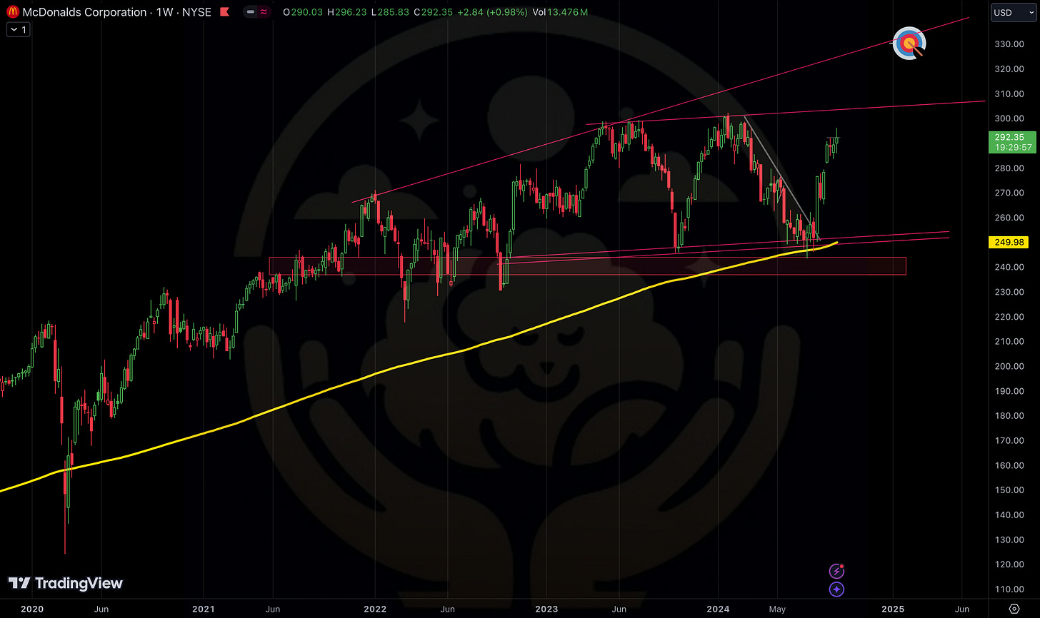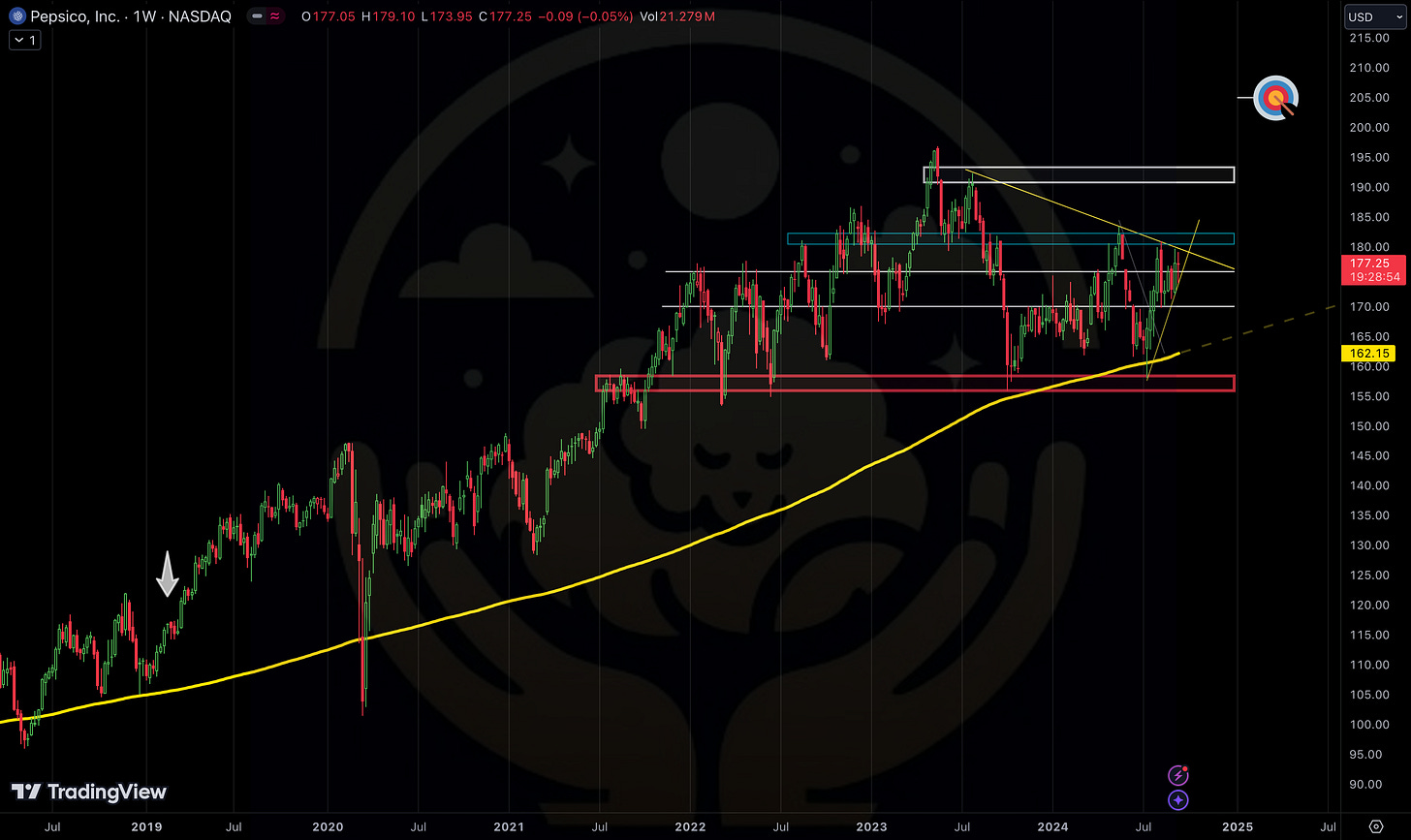 I am actively watching PEP and MCD here as I anticipate another small rally in those names so I can re allocate in favor of more risk on names like the ones mentioned above, and SPX. (To reduce or to exit entirely is the question. I am unsure yet as their long term charts look very bullish to me. (charts below)