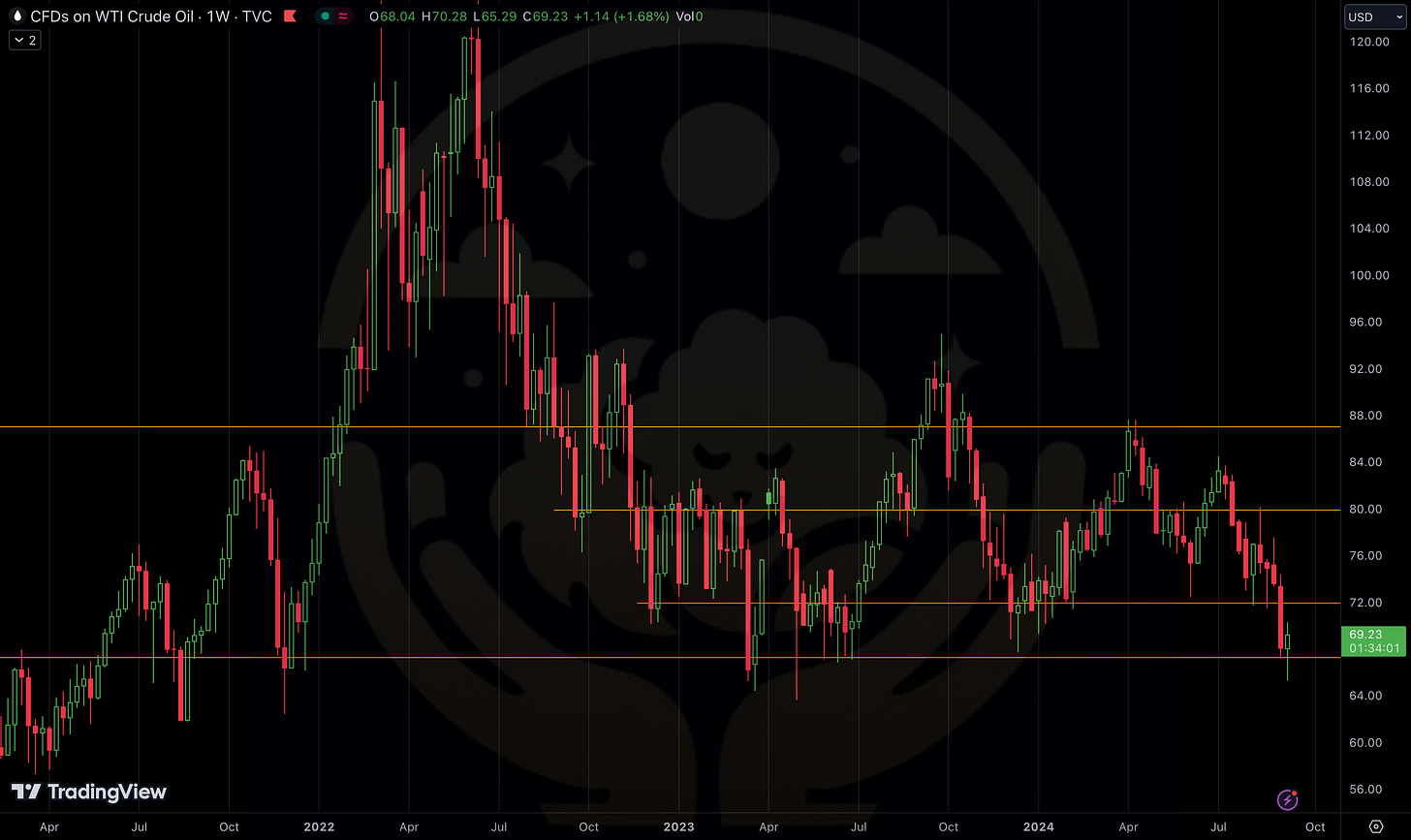 The recent decline in oil prices is a significant factor contributing to the overall disinflationary trend. This price reduction offers valuable insights into the current state of global economic growth. Based on my analysis, oil prices are likely to stabilize around the $67, as highlighted two weeks ago. Until global growth concerns and recession fears subside, oil prices may remain within this $67 - $72 range. Once these anxieties dissipate, I anticipate a rebound towards $76 per barrel. The recent downward trend in oil prices will continue to support disinflationary pressures throughout the remainder of 2024. Longer term, oil’s supply and demand dynamics will always be in control of the commodities price.